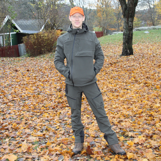Ett mycket stilfullt set, med detaljer för att smidigt röra sig tyst i skogen. Snygg passform. Fin grön färg. Ska bli kul att testa skarpt nu i vinterkyla. Gillar snedställda dragkedjan, magfickan och ryggfickan.Kanske välja en storlek större än normalt.